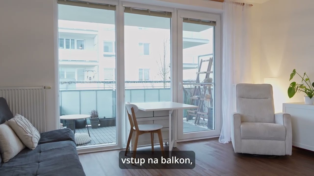 Srdcem bytu je vkusně upravený moderní prostor kuchyně s elegantní kuchyňskou linkou a výkonnými spotřebiči s indukční deskou, který volně přechází v obývací pokoj s jídelním stolem, pohovkou a francouzským oknem se vstupem na balkon.